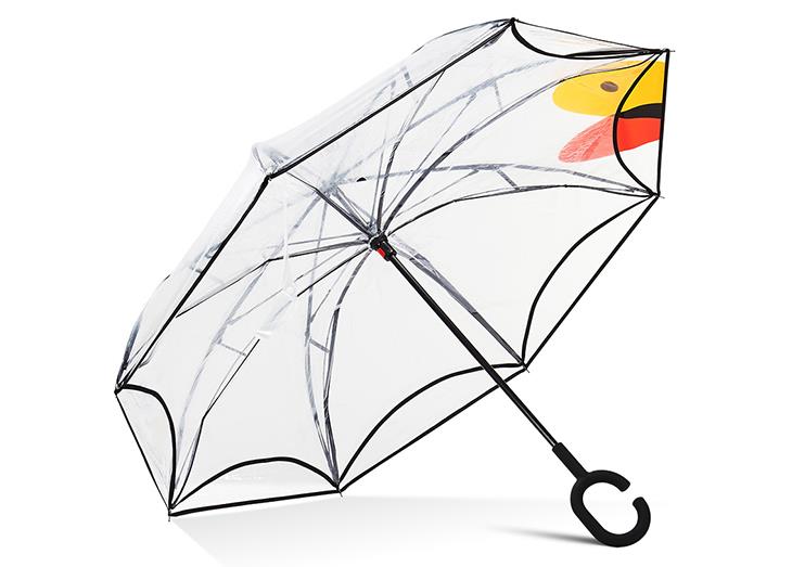 反向伞顾名思义是伞面反过来的雨伞。与传统雨伞相比,传统雨伞的缺点在反向伞上几乎都有改善。小黄鸭透明反向伞结合透明设计及可爱的小黄鸭印花点缀,使其既童趣又保持了视野的清晰。
